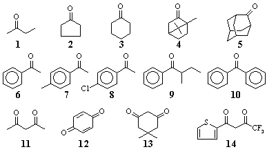 Надежно установлено [1], что озонолиз ненасыщенных органических соединений протекает через стадию образования 1,2,3-триоксолана, который в дальнейшем распадается на карбонилоксид и кетон (или альдегид). 1,3-Циклоприсоединение карбонилоксида к связи C=O завершается образованием стабильного продукта озонолиза - 1,2,4-триоксолана. Таким образом, последняя реакция является важнейшей в механизме озонолиза олефинов, однако количественные данные о скорости этой реакции, а также о влиянии структуры реагентов на константу скорости практически отсутствуют. В настоящей работе методом импульсного фотолиза и кинетической спектрофотометрии измерены константы скорости реакции бензофеноноксида (БФО) с кетонами и дикетонами 1-14 в среде CH3CN и C6H6 при комнатной температуре.