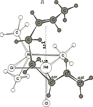 д) Модель структуры активного центра с локализованной sg-связью Nd-Cg концевого звена с атомом неодима.