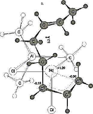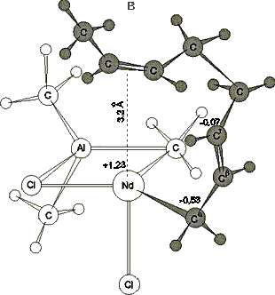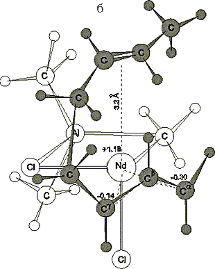 а) Модель анти-структуры активного центра, характеризующая p-аллильное связывание концевого звена с атомом неодима;