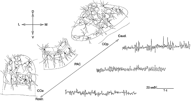 Опираясь на существующее в литературе мнение о важном значении дендритов в функциональной организации нервной системы [2] и данные о том, что для определенного вида нейронов, в частности, мультиполярных и веретеновидных клеток, характерен определенный паттерн отводимой от них фоновой импульсной активности [14], мы предположили, что выявленные нами особенности нейронной организации СОа, РАС, СОр, а именно преобладание определенных форм нейронов, пространственное их расположение, степень разветвленности и протяженности отростков, а также разобщенность трех отделов в пространстве, не могут не сказаться на физиологических особенностях отделов кортикального ядра.
