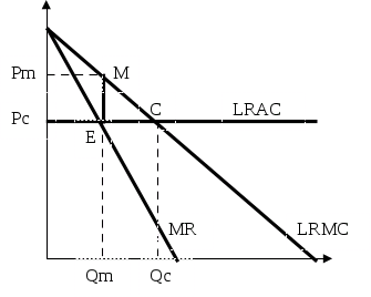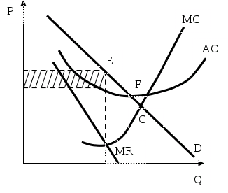 Прибыль максимальна, если при равенстве предельной выручки предельным издержкам предельная выручка с увеличением выпуска сокращается в большей степени, чем предельные издержки. В условиях максимизации прибыли монополистом предельные издержки, в отличие от модели рынка совершенной конкуренции, могут убывать. Монополист может, максимизируя прибыль, отказаться от повышения выпуска, даже если предельные и средние издержки производства снижаются. Это, как известно, служит одним из аргументов в пользу тезиса о производственной неэффективности монополии [7, c.91-92].
