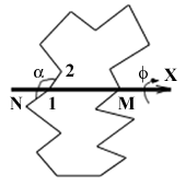5. Цикл перегибается по линии соединения до придания независимому валентному углу a 21N заданного значения. Соответствующий угол f 21MN может быть вычислен по формулам пункта (3), если в качестве параметров R1 и R2 взять легко вычисляемое конечное и исходное значения межъядерного расстояния R2,N. При этом также возникает два варианта решения, для выбора из которых необходимо ввести второй знаковый параметр sgn2. Если заданный угол a несовместим с условием замыкания цикла (при этом abs(C/r) > 1), то его следует увеличить, если C > 0, или уменьшить, если C < 0.