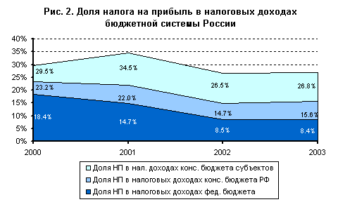 Помимо этого, с 2002 г. наблюдается сокращение поступлений налога на прибыль на всех уровнях бюджетной системы (см. рис. 2).