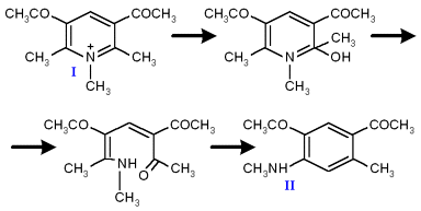 Ранее было показано [1,2], что рециклизация 3,5-диацетилпиридиниевой соли (I) под действием водно-спиртовой щелочи приводит к получению 2,4-диацетил-N,5-диметиланилина (II) с выходом 85% (схема 1).