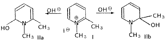 В результате нуклеофильной атаки исходной соли (I) возможно образование двух псевдооснований IIa,b (схема 2):
