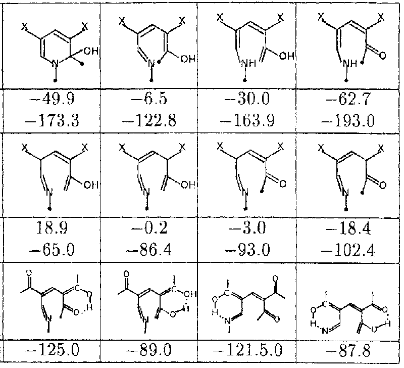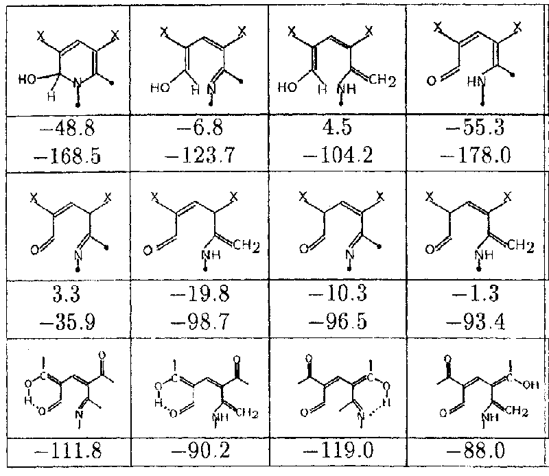 Раскрытие псевдооснований IIa,b может приводить к образованию двадцати двух таутомерных раскрытых форм (см. табл.). Легко видеть, что их энтальпии образования (приведенные для конформера, ближайшего к псевдооснованию), весьма различаются. При условии установления термодинамического равновесия это означает, что относительное содержание всех раскрытых интермедиатов, за исключением кето-аминных форм с неразрывной цепью сопряжения, будет исчезающе малым.