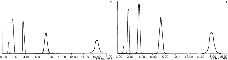 Протокол компьютерного эксперимента содержит следующие результаты расчета: общее время хроматографирования смеси tобщ; характеристики пиков (абсолютное время удерживания, полуширину и относительную площадь), а также коэффициенты разрешения Кразр рядом стоящих пиков. Протокол и модельная хроматограмма смеси выводятся на экран, сохраняются на диске и могут быть выведены на печать. В протоколе также указываются все введенные пользователем данные. Пример рассчитанной компьютером хроматограммы - на рис.1б. Состав смеси и условия разделения на рис. 1а и 1б аналогичны.