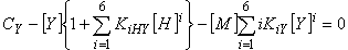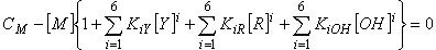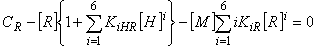 Реализация такой модели традиционным способом, то есть с помощью условных констант [3], в общем случае невозможна: величина [R], необходимая для их вычисления, заранее не известна и меняется по ходу титрования. Условие материального баланса по М, R и Y, примененное к вышеописанной модели, приводит к системе из трех уравнений, а именно: