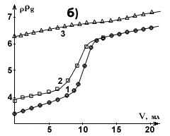 Рис. 2. Рассчитанные (а) и полученные по потенциометрическим данным (б) кривые комплексонометрического титрования ионов серебра в присутствии аммиака: 1 - без аммиака; 2 - СNHз = 0,0010 М; 3 - СNHз = 0,010 М; СAg = 0,0010 М; VAg = 20 мл; pH 10 |