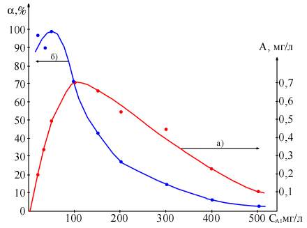 Характерной особенностью извлечения алюминия углеродным сорбентом Техносорб-1 является кооперативный эффект коагуляции гидроксида алюминия на поверхности сорбента и в объемной фазе раствора, сопровождающий кажущееся уменьшение величины извлечения в области начальных концентраций более 100 мг/л (рис.1). Максимальный вклад эффекта объемной коагуляции гидроксида алюминия наблюдается в области начальных концентраций от 200 до 300 мг/л.