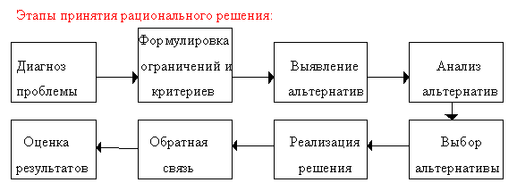 Этапы принятия рационального решения: диагноз проблемы, формулирование ограничений и критериев для принятия решений, выявление альтернатив, анализ и оценка альтернатив, окончательный выбор альтернативы, реализация решения, обратная связь, оценка результатов.