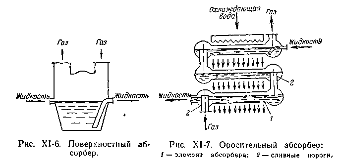 В абсорберах этого типа поверхностью соприкосновения фаз является зеркало неподвижной или медленно движущейся жидкости, или же поверхность текущей жидкой пленки.