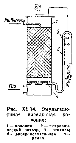 В обычных насадочных колоннах поддержание режима эмульгирования представляет большие трудности. Имеется специальная конструкция насадочных колонн с затопленной насадкой, называемых эмульгационными (рис.XI-14). В колонне 1 режим эмульгирования устанавливают и поддерживают с помощью сливной трубы, выполненной в виде гидравлического затвора 2. Высоту эмульсии в аппарате регулируют посредством вентилей 3. Для более равномерного распределения газа по сечению колонны в ней имеется тарелка 4. Эмульгационные колонны можно рассматривать как насадочные лишь условно. В этих колоннах механизм взаимодействия фаз приближается к барботажному.