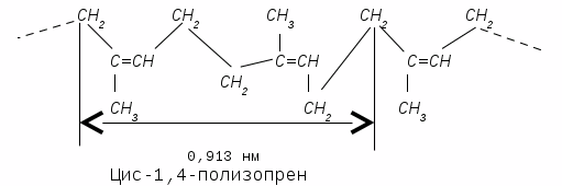 Макромолекула каучука имеет спиральное строение с периодом идентичности 0,913 нм и содержит более 1000 изопреновых остатков. Строение макромолекулы каучука обеспечивает его высокую эластичность – наиболее важное техническое свойство. Каучук обладает поразительной способностью обратимо растягиваться до 900% первоначальной длины.