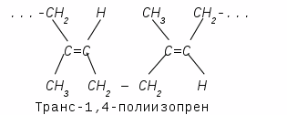 Сопряженные диеновые углеводороды при ионной полимеризации в зависимости от характера катализатора образуют различно построенные полимерные цепи. Различают два типа цепеобразования: цис-1,4, транс-1,4 и цис-1,2. Полимеризация изопрена в присутствии триалкилалюминия и хлорида титана (IV) приводит у цис-1,4-полимеру, в котором цис-построеные остатки диена связаны друг с другом в положении 1,4: