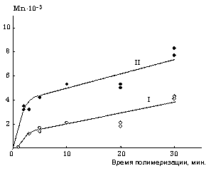Рис. 6. Зависимость среднечисленной молекулярной массы ПБ, полученного на к.с. UO2Cl2.2ТБФ (I) и UO2Cl2.2ДГСО (II) от времени ПМ. Условия: как на рис. 3.