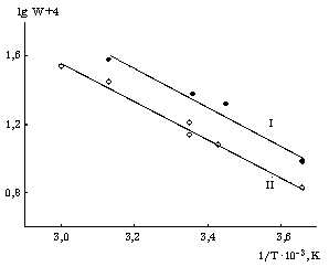 Рис. 5. Аррениусовская зависимость скорости ПМ бутадиена на к.с. UO2Cl2.2ТБФ (I) и UO2Cl2.2ДГСО (II) . Условия: как на рис. 3.