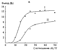 Рис. 1. Зависимость выхода (а) и содержания звеньев (б) ПБ, полученного на к.с. UO2Cl2.2ТБФ (I) и UO2Cl2.2ДГСО (II) от соотношения Al/U. Условия: толуол, 250 C, Cu=2.10-3, Cб=1,5 моль/л; время ПМ = 1ч.