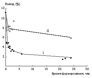 Как показано в работе [9], к.с. UCl4.2L-AlR3 активна только при ее формировании отдельно при 80-900 С с добавкой диена. Применение подобного метода активации к комплексу UO2Cl2.2ТБФ-ТИБА не дает аналогичных результатов (рис. 2). При его выдерживании отдельно без и с добавками бутадиена хотя и происходит улучшение стереоспецифичности действия катализатора (ПБ содержит до 85 % 1,4-цис-звеньев), но происходит снижение активности по сравнению с ПМ, проведенной in situ (точка на оси ординат, рис. 2). Причем с увеличением времени экспозиции к.с. выход ПБ заметно снижается. С учетом этих данных все последующие эксперименты проводили в условиях in situ.