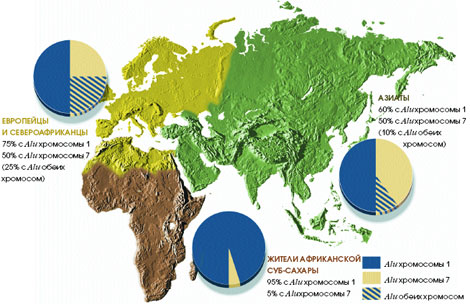 Но для грубого распределения по группам можно воспользоваться полиморфизмами, возникающими с неодинаковой частотой в разных регионах планеты. Одно из семейств таких полиморфизмов составляют полиморфизмы Alu — короткие участки ДНК с одинаковой последовательностью нуклеотидов. Время от времени Alu реплицируются, и образующиеся копии непредсказуемым образом внедряются в новые сайты той же или другой хромосомы (присутствие Alu на новом месте, как правило, не отражается на функционировании соседних генов). Коль скоро произошла такая вставка Alu-элемента, он может оставаться на новом месте неопределённо долгое время, передаваясь из поколения в поколение. А значит, если два человека — носители одинаковой Alu-последовательности в одном и том же месте генома, то они должны иметь общего предка, наделившего их специфическими сегментами ДНК.
