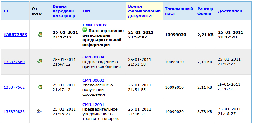 Далее документ перемещается уже по ведомственной сети ФТС. Скорость его перемещения можно оценить по ответам серверов ФТС. У этих ответов в поле «От кого» нарисован зеленый значок таможенника (второе и третье сообщение). Серверы подтверждают прибытие документов следующими сообщениями: