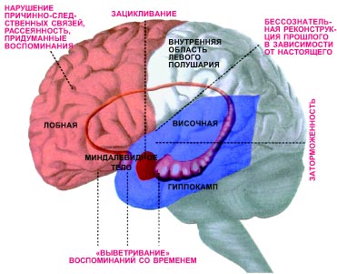 Участки мозга человека, отвечающие за различные виды забывчивости: „выветривание“ воспоминаний со временем, рассеянность, заторможенность (например, человек забыл слово, вертящееся на языке), нарушение причинно-следственных связей в воспоминаниях, придуманные воспоминания, бессознательная реконструкция прошлого в зависимости от настоящего, зацикливание (воспоминание, которое безуспешно стараются забыть, никогда не достигая этого). Такую модель предложил психолог Гарвардского университета (США), известный специалист в области исследования механизмов памяти Даниэль Шахтер. |
