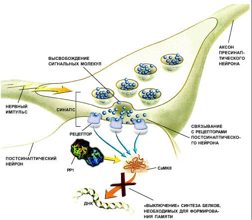 Молекулярный механизм забывчивости. Процесс запоминания в гиппокампе, куда поступает новая информация, происходит в три стадии: — нервный импульс вызывает высвобождение сигнальных молекул („молекул памяти“) из нервных окончаний аксона пресинаптического нейрона; — молекулы нейромедиатора связываются с рецепторами постсинаптического нейрона; — рецепторное связывание активирует фермент СаМКII, участвующий в формировании памяти. PP1 блокирует CaMKII. В результате этот фермент теряет способность посылать сигналы о начале синтеза белков, необходимых для формирования нервного импульса. Так PP1 „выключает“ механизм запоминания. |