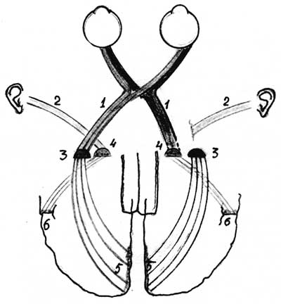 Рис. 3. Операция подсадки зрительного тракта к медиальному коленчатому телу таламуса. Слева показан нормальный ход нервных путей от глаз и ушей, справа — их расположение после операции. (Нервные пути, несущие слуховую информацию, отсекали от медиальных коленчатых тел и на их места подсаживали окончания зрительных нервов, отделённые от латеральных коленчатых тел таламуса. Было уничтожено также нижнее двухолмие в среднем мозге, где переключается часть нервных путей от уха в слуховую кору (не показано на схеме): 1 — зрительный тракт, 2 — слуховой тракт, 3 — латеральные коленчатые тела таламуса, 4 — медиальные коленчатые тела таламуса, 5 — таламокортикальные пути к зрительной коре, 6 — таламокортикальные пути к слуховой коре. |