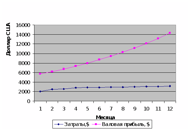 Затраты фирмы по отношению к доходам на первый месяц составят 23% или 23 копейки с каждого рубля. Затраты фирмы по отношению к доходам к концу года будут равны 17% или 17 копеек с каждого рубля. Рассчитанные выше коэффициенты прибыльности доказывают выгодность вложения капитала в данную фирму.