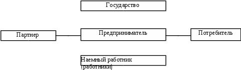 Основным субъектом предпринимательской активности выступает предприниматель. Однако предприниматель — не единственный субъект, в любом случае он вынужден взаимодействовать с потребителем как основным его контрагентом, а также с государством, которое в различных ситуациях может выступать в качестве помощника или противника. И потребитель и государство также относятся к категории субъектов предпринимательской активности, как и наемный работник (если, конечно, предприниматель работает не в одиночку), и партнеры по бизнесу (если производство не носит изолированного от общественных связей характера) (рис. 1).