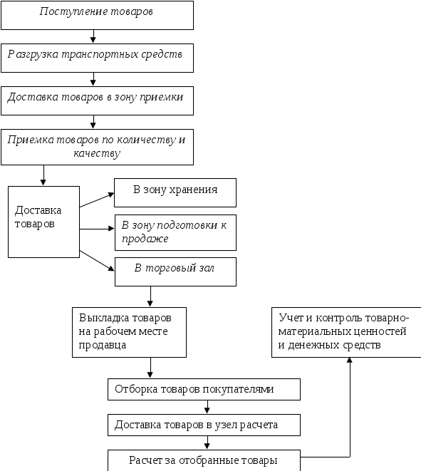 Технологический процесс включает в себя совокупность последовательно взаимосвязанных способов, приемов и трудовых операций, направленных на сохранение потребительских свойств товаров и ускорения доведения товаров до торговой сети и потребителей. Технологический процесс обеспечивает обработку потоков, начиная с поступления товаров в магазин и кончая полной подготовкой их к продаже. Технологический процесс включает такие операции, как приемка товаров по количеству и качеству, хранение, фасовка и упаковка товаров, их перемещение и выкладка в торговых залах магазинов и др.