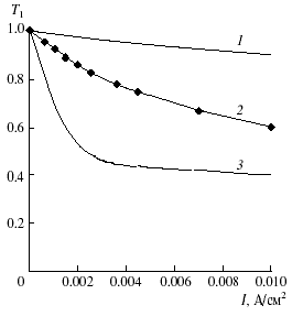 При заданной форме кривой T(i) зависимость толщины диффузионного слоя от плотности тока полностью определяется расположением вольт-амперной кривой Ui относительно теоретической U*, рассчитанной по модели с постоянной толщиной диффузионного слоя. Этот вывод имеет в большей степени теоретическое значение, так как реально наблюдаемые на практике вольт-амперные кривые лежат, как правило, много выше теоретической кривой U*, поэтому в таких системах наблюдается уменьшение толщины диффузионного слоя, которое при токах значительно превышающих предельный может составлять величину более 80% от исходной толщины δ0 (рис. 5).