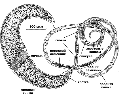 Нематоды оказались не известны науке. Вместе с американским нематодологом Д.Хоупом мы исследовали их строение, описали новый вид и отнесли его к новому роду — Smithsoninema inaequale [2]. Родовое название нематода получила в честь Смитсоновского института, видовое — отражает большое различие между самцом и самкой.