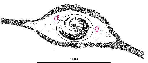 По аналогии с приведенными примерами наших камаколаймидных нематод, также живущих попарно и отличающихся половым диморфизмом, можно считать специфическими симбионтами фораминифер. Из осторожности пока будем пользоваться нейтральным термином “симбиоз”, который, по определению его автора, А. де Бари, предполагает любую форму взаимоотношений двух разных видов, будь то мутуализм (от лат. mutuus — взаимный), при котором оба вида получают взаимную пользу от сожительства, комменсализма (от фр. commensal — сотрапезник), когда сожитель делит стол и кров с хозяином, не вступая с ним в тесные отношения, или паразитизм (от греч. parasiton — нахлебник), при котором жизнь одного вида протекает за счет другого с принесением ему очевидного ущерба. Скорей всего, фораминиферные нематоды — грубые паразиты. Об этом говорит их тип питания (нематоды в принципе по своей локализации и по морфологии не могут питаться ничем, кроме органического вещества хозяина), деградация цитоплазмы в пораженной раковинке и, наконец, попытки простейшего защититься от червей путем окружения их кожистой капсулой.