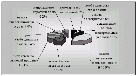 На диаграммах 1 и 2 продемонстрирована динамика числа малых предприятий России, воспользовавшихся ссудами банков в период 1995-1999 г.г., а также распределение факторов, определяющих отказ субъектов малого предпринимательства от получения кредитов. Диаграммы составлены на основе данных, полученных в результате опроса руководителей малых предприятий Российским независимым институтом социальных и национальных проблем. Эти графики иллюстрируют уже описанную ситуацию. С начала 90-х годов активность сотрудничества российских малых предприятий с отечественными и зарубежными кредитными институтами неуклонно падала. При этом в 1999 г. лишь 14,1 % малых предприятий смогло получить ссуды для финансирования капиталовложений, остальные 13,8 % использовали кредиты в целях восполнения недостатка собственных оборотных средств. В диаграмме 2 особенно обращает на себя внимание тот факт, что полное отсутствие «взаимоотношений» малого бизнеса с банками вряд ли возможно. Какой-то минимум сотрудничества банков и организаций существует всегда, хотя бы на уровне обслуживания расчетных счетов. Следовательно этот фактор следует понимать скорее как невозможность получения от партнерского банка не только кредитных, но и любых других услуг.1