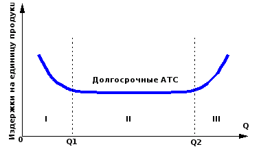 В случае достаточной продолжительности временного интервала с постоянной отдачей от применяемых производственных факторов, когда положительный эффект масштаба уже себя исчерпал, а отрицательный не вступает в действие до тех пор, пока не достигнуты значительные объёмы производства, одинаково эффективными окажутся и крупные и небольшие фирмы. На рис. 11 показана эта ситуация на том отрезке кривой долгосрочных средних издержек, который описывает объём производства, равный Q>1>Q>2>.
