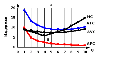 Средние постоянные издержки AFC - рассчитываются путём деления общих постоянных издержек на количество произведенной продукции, т.е. AFC = TFC/Q. Так как величина постоянных издержек не зависит от объёма производства, то конфигурация кривой AFC имеет плавный нисходящий характер и свидетельствует о том, что с ростом объёма производства сумма постоянных издержек приходится на всё возрастающее количество единиц производимой продукции.
