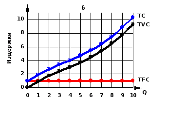 Сумма постоянных и переменных издержек при каждом данном объёме производства образует общие издержки TC. Из графика видно, что для получения кривой общих издержек сумму постоянных издержек TFC необходимо прибавить к сумме переменных издержек TVC (рис. 1).