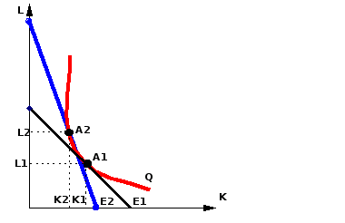 Чтобы сохранить прежний объём выпуска (остаться на прежней изокванте Q), фирме необходимо осуществить технологическую замену капитала трудом. Угол наклона изокосты увеличится, и она примет положение E>2>. Теперь фирма будет минимизировать свои издержки в точке A>2>, применяя K>2> единиц капитала и L>2> единиц труда.