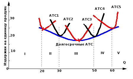 На рис. 10 представлены пять различных вариантов (I-V) размеров предприятия, рассчитанных на производство различных объёмов продукции при наименьших средних издержках ATC. Эти варианты фирма может рассматривать как ступени своего роста. На каких-то промежутках (ступенях) своей деятельности она не меняет своих производственных мощностей, а использует то, что имеется, т.е. можно полагать, что на каждой ступени фирма функционирует в краткосрочном периоде. Поэтому кривая, описывающая её издержки на данном этапе, будет кривой краткосрочных средних общих издержек.