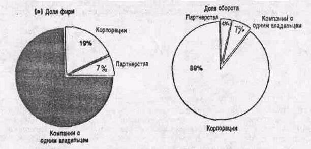 Компания с одним владельцем—это фирма, принадлежащая одному владельцу, который единолично управляет ею, получает всю прибыль, но и лично отвечает по всем ее обязательствам. Такие компании распространены очень широко. Они невелики и наиболее характерны для строительной индустрии и розничной торговли. На рис. 1. показано, что промышленные компании с одним владельцем составляют более 70% всех фирм, дающих федеральному правительству налоговую прибыль. Но эта прибыль скромна, только 7% от общих поступлений. Отметим, что огромное число сельскохозяйственных ферм организованы аналогичным образом, но они не включены в статистику, представленную на рис. 1.