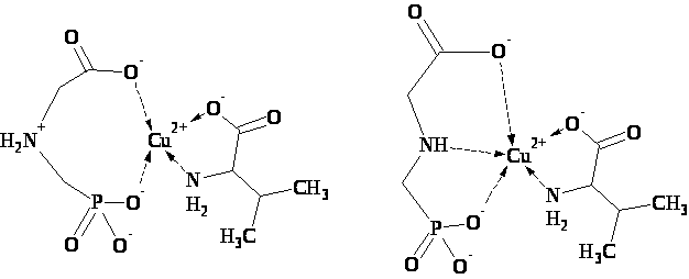 По данным электронных спектров в комплексе CuPMG24 одна из донорных групп не принимает участие в связывании, а один из лигандов координирован бидентатно. В системе медь(II) N-фосфонометилглицин аминокислота возможно образование разнолигандных комплексов, имеющих высокую устойчивость, что необходим учитывать при моделировании процессов, протекающих в биологических системах с участием иона металла и глифосата.