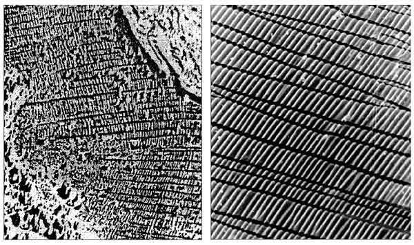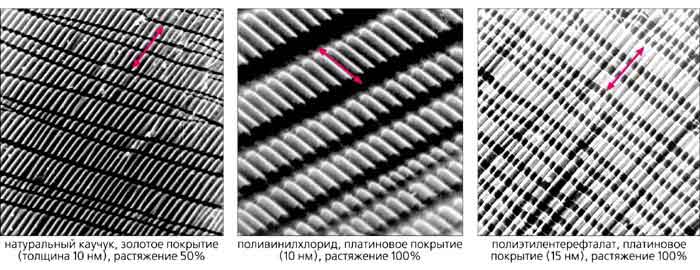 Удивительно, что при всем том научном интересе, который проявляют исследователи к подобным системам, до недавнего времени никому не пришло в голову просто растянуть упаковочную армированную пленку (она как раз и представляет собой типичную систему “твердое покрытие на податливом основании”) и посмотреть, что из этого получится. А посмотреть, как оказалось, есть на что: в микроскоп (сканирующий электронный) видны ряды светлых полос с регулярным волнистым рельефом, разделенных темными полосами.