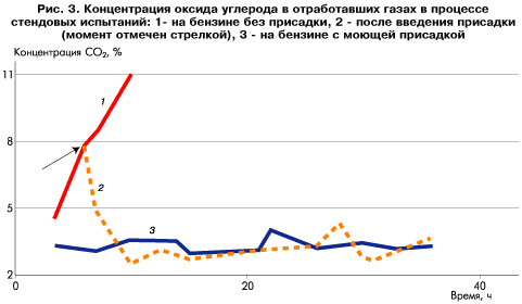 Через 30 лет история повторилась. Появились двигатели с распределенным впрыском бензина «на клапаны» и рециркуляцией отработавших газов, что позволило эффективно снизить выбросы оксидов азота. Но при этом работа впускных клапанов была поставлена в жесткие условия, на их поверхности образовывались толстые (до 2 мм толщиной) отложения. Известные моющие присадки оказались непригодны, и были разработаны присадки нового поколения, которые сейчас и составляют основную массу товарных моющих присадок за рубежом. Об их эффективности можно судить по рис. 3, на котором представлены результаты определения концентрации СО в отработавших газах инжекторного двигателя, работающего на бензине без присадки и с присадкой. Показано также, как на этот показатель влияет введение присадки в процессе работы двигателя [6].
