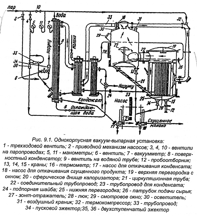 В установившемся режиме молоко последовательно поступает в первый и торой подогреватель. В первом продукт нагревается вторичным паром до 60-66ºС, во втором – острым паром до 70-75ºС. По мере образования конденсата, его непрерывно откачивают насосом. Если установка работает по принципу непрерывного сгущения, то готовый продукт откачивается по мере достижения заданной концентрации.