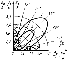 Рис.9. Значения модулей упругости (1), сдвига (2) и коэффициентов Пуассона (3) под углом к главному направлению композиционного материала, образованного системой трех нитей