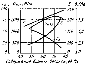 Рис.11. Зависимость механических свойств бороволокнита КМБ-1 от содержания борного волокна: