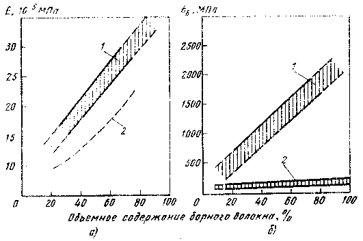 Рис.5. Зависимость модуля упругости Е (а) и временного сопротивления σВ (б) бороалюминиевого композиционного материала вдоль (1) и поперек (2) оси армирования от объемного содержания борного волокна