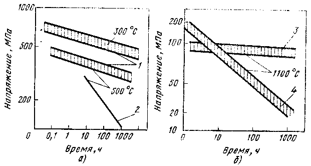 Рис.6. Длительная прочность бороалюминиевого композиционного материала, содержащего 50% борного волокна, в сравнении с прочностью титановых сплавов (а) и длительная прочность никелевого композиционного материала в сравнении с прочностью дисперсионно-твердеющих сплавов (б)