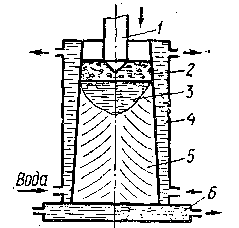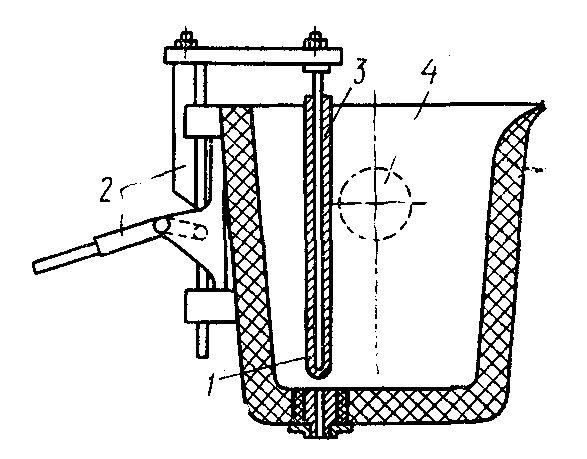 Кислородный конвертер (рис. 1) представляет собой сосуд 1 грушевидной формы из стального листа, футерованный внутри основным кирпичом 2. Рабочее положение конвертера вертикальное. Кислород подается в него под давлением 0,8...1 МПа с помощью водоохлаждаемой фурмы 3, вводимой в конвертер через горловину 4 и располагаемой над уровнем жидкого металла на расстоянии 0,3...0,8 м.
